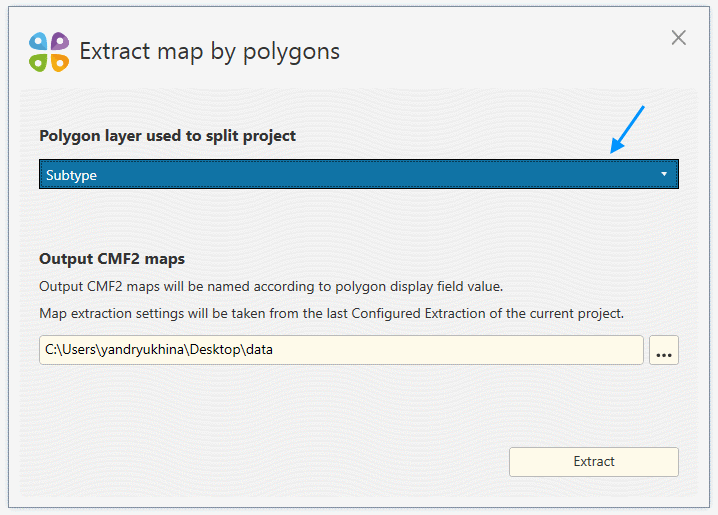 3) Select location for output CMF2 maps and press Extract to start extraction. Please note that maps will be named according to the display field value of polygons that were used to split it.