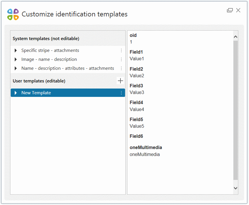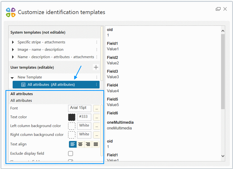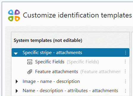Only basic templates customization is available in the Identification templates management menu. All settings are available in the Map tab of Configured Extraction window, in the bottom right corner of the screen below the section where you choose which identification template should be used for the selected layer.
