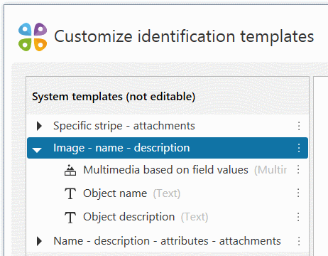 This template demonstrates image based on field value, then name of the object (Text stripe) and description (Text stripe). It can be used to create colorful object cards that should not contain all attribute info.