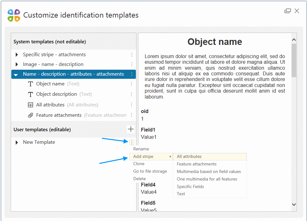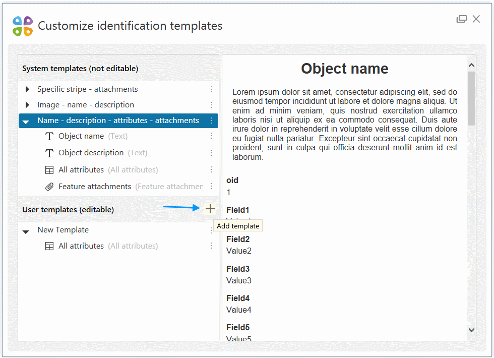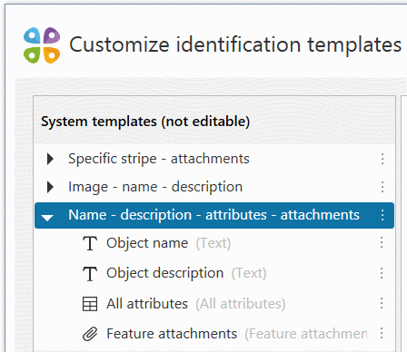 You can customize existing templates for identification dialogs displayed in the output mobile map or create your own templates. To access identification templates management menu press the Customize Identification templates button on the CarryMap Builder toolbar.