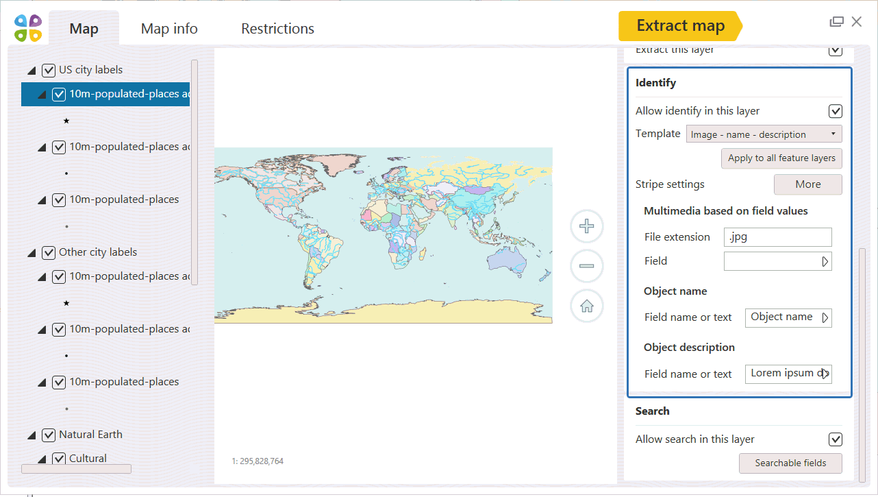 With this stripe, you can add custom text to every object card in the layer or add value from some specific field. You can customize text or background options for this stripe in Identification Templates Management menu. In case you want to display value of some field this field should be chosen in Map tab of Configured extraction window.