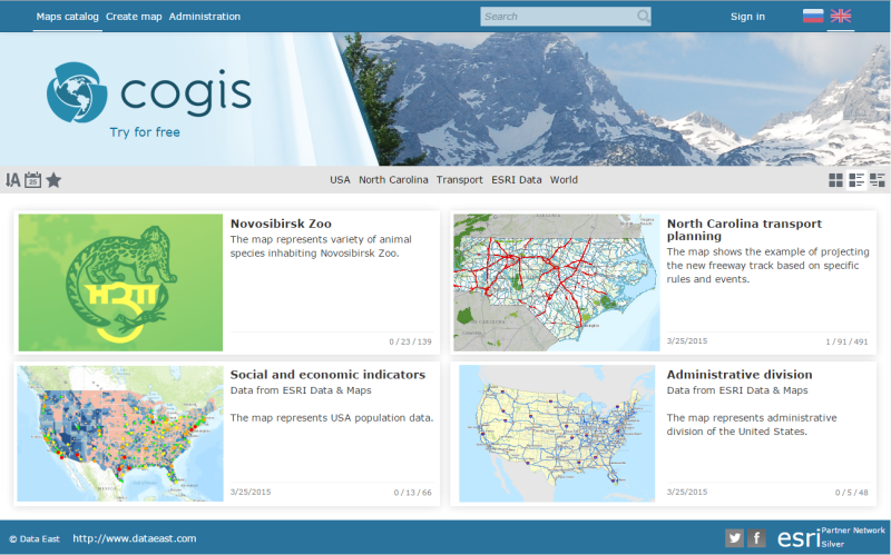 The interactive maps catalogue represents the grouped list of existent maps in a user-friendly format.