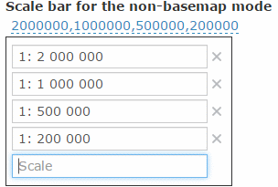 Scale bar for the non-basemap mode – this mode is used, if basemap of your interactive map has been disabled. To make the scales list or add the new scale to the existent list, press the scales list button. Enter the new scale value to the Scale field or edit the existent values in the list.