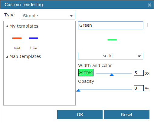 Symbology templates - the new symbol can be saved as your own template. To do this enter its name and press Save button. The template will be saved in the My templates list of the Custom rendering dialog and will be further available when editing the layers rendering parameters in the Graphics drawing tool. Besides this, the templates can be saved as Map templates in the Saved drawing and layers rendering templates section of the User interface constructor tab.