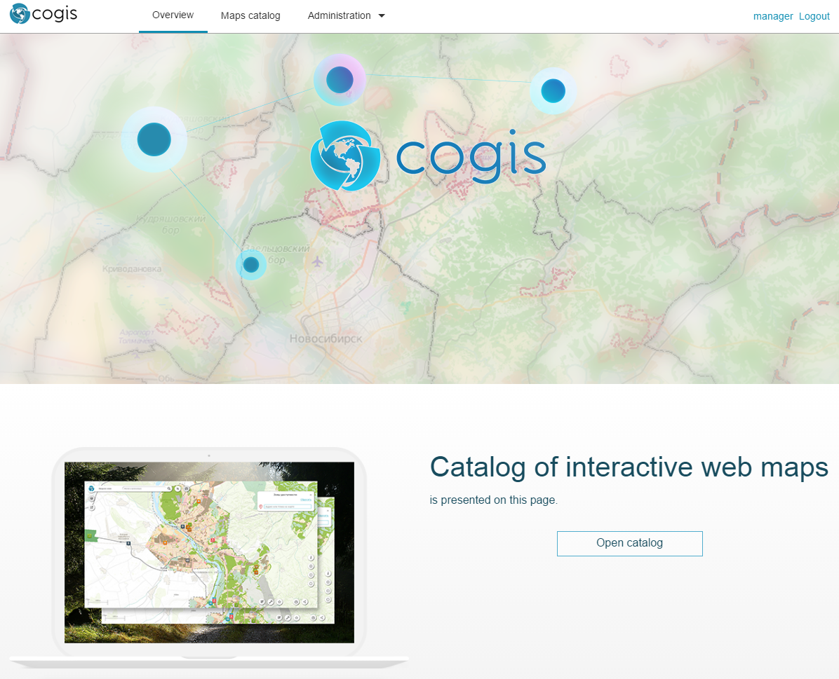 The main CoGIS portal page is the overview page with the selected interactive maps. Each map or map folder can be displayed on the separate page stripe accompanied with large thumbnail and detailed description, or displayed among other maps and folders accompanied with small thumbnail and name. The interactive maps on the Overview page are located same as they are in the Maps catalog.