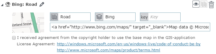 License agreement check box – the check box to express your agreement with the licensing policy related to use of maps published on the Bing Maps internet service.