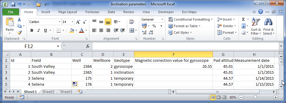 Example of the table file in the *.xlsx format with the inclination data parameters to be loaded to the database using the "Load inclination data" geoprocessing tool.