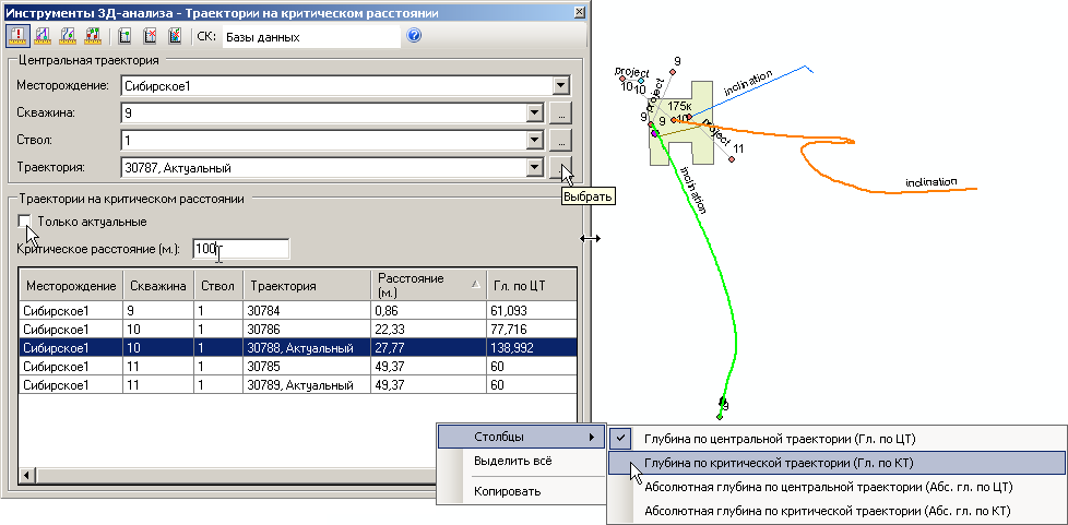 Активное условие Только актуальные покажет в таблице результатов только активные геометрии стволов, находящиеся на критическом расстоянии от центральной траектории.