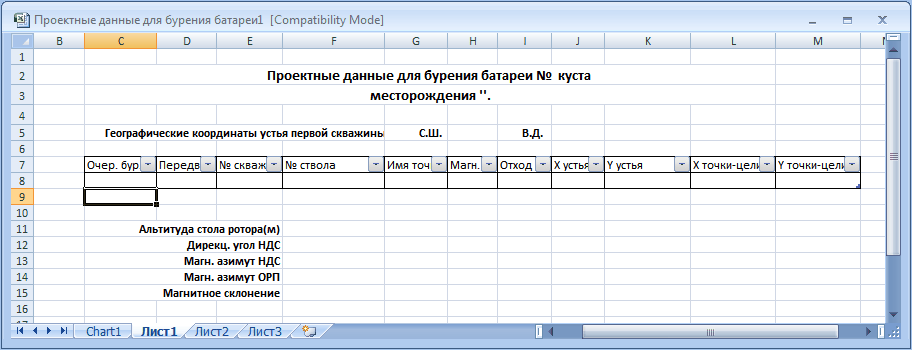 xlt -шаблон отчета " Проектные данные для бурения батареи"