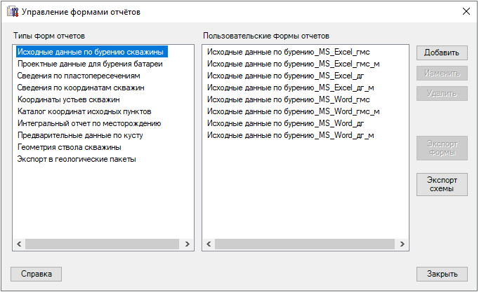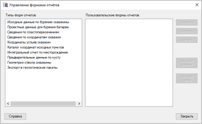 В левой части появившегося диалогового окна вы увидите список типов форм отчётов, используемых в работе приложения WellTracking. В правой части появится список пользовательских форм отчетов, который пользователь сам введет или создаст на основе предложенного типа отчета. Список типов форм отчетов соответствует инструментам группы Отчеты.