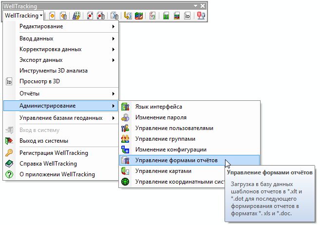 Для того чтобы получить доступ к управлению формами отчётов следует из ниспадающего меню WellTracking выбрать меню Администрирование. В появившемся подменю следует выбрать пункт Управление формами отчётов.