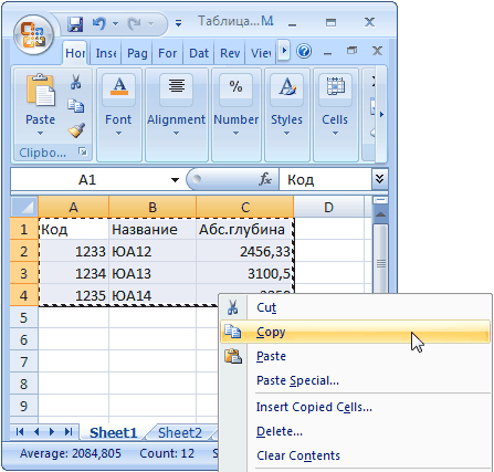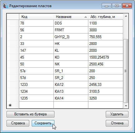 Функция Скопировать из буфера позволит пользователю ввести в список пластов значения из таблиц *.xls. Откройте таблицу, выделите и скопируйте в буфер обмена необходимые строки.