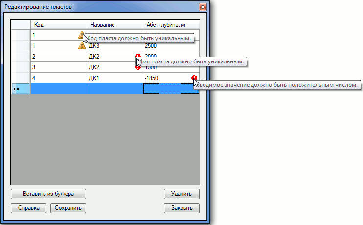 Для удаления пластов из базы выделите необходимые строки и нажмите на кнопку Удалить.