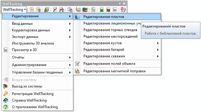 Для того чтобы редактировать библиотеку пластов базы данных WellTracking был разработан инструмент Редактирование пластов. Он вызывается из меню Редактирование.