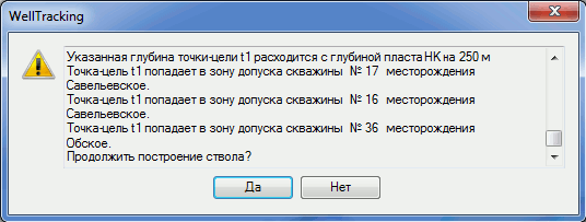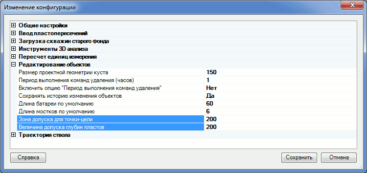 Размер зоны допуска вокруг точки-цели и проектного ствола задается в разделе Администрирование >Изменение конфигурации > Редактирование объектов. По умолчанию установлена величина 200 м.