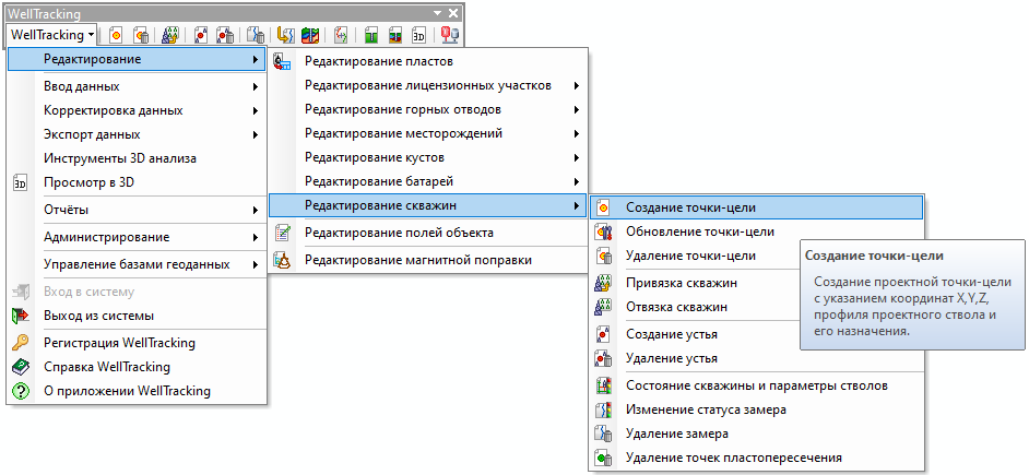 Для того чтобы создать в базе данных новый объект проектная точка-цель следует из ниспадающего меню WellTracking выбрать меню Редактирование скважин. В появившемся подменю следует выбрать пункт Создание точки-цели.