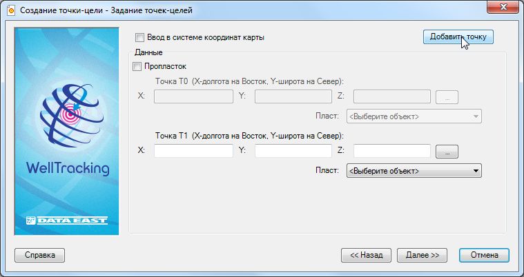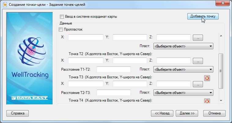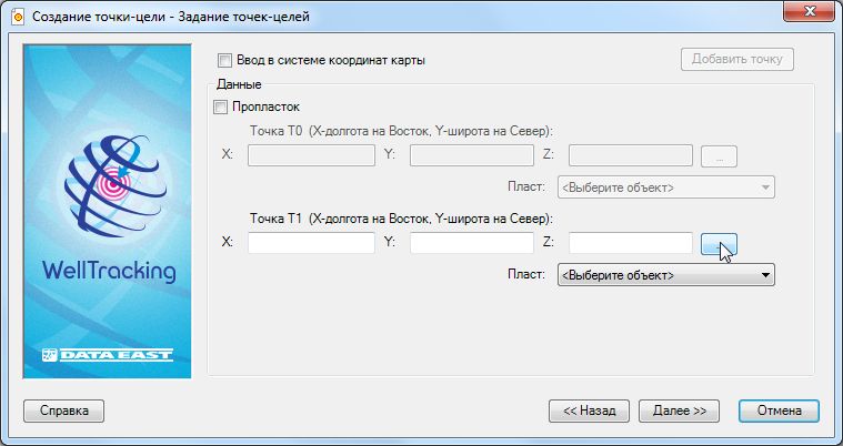 На этом этапе следует ввести координаты X, Y точки-цели и выбрать пласт из соответствующего списка библиотеки пластов БГД для определения Z.