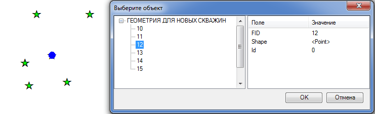 Если в рамку попадет несколько точек, то необходимую можно выбрать из таблицы Выберите объект. Выделенная строка в таблице подсветит точку на карте.