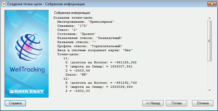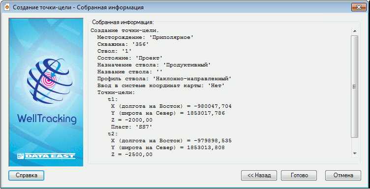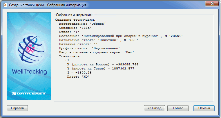 Заключительным шагом построения точки-цели является ознакомление с результирующим диалоговым окном. Если вы согласны с введенными параметрами, то нажмите кнопку Готово и процесс построения точки-цели завершится.