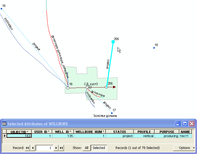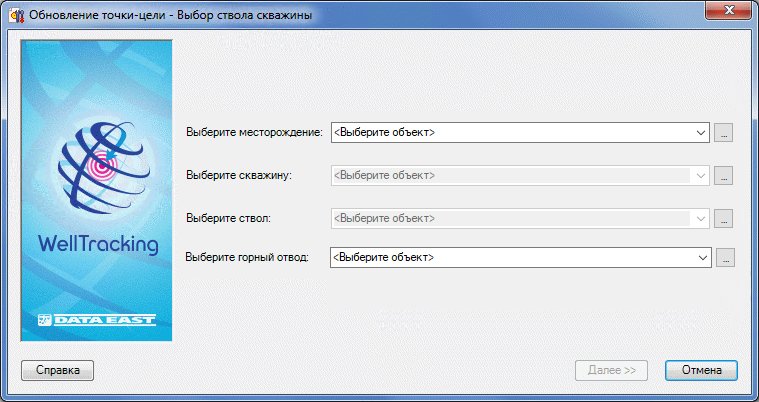 Выбор объектов (месторождение, скважина, ствол) можно осуществить из соответствующих списков или же с карты при помощи курсора. Нажмите на кнопку Выбрать и щелкните курсором по нужному стволу. Диалоговое окно автоматически заполнится.