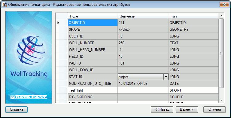 атрибуты (белое поле) обновляемой точки-цели и по кнопке Далее