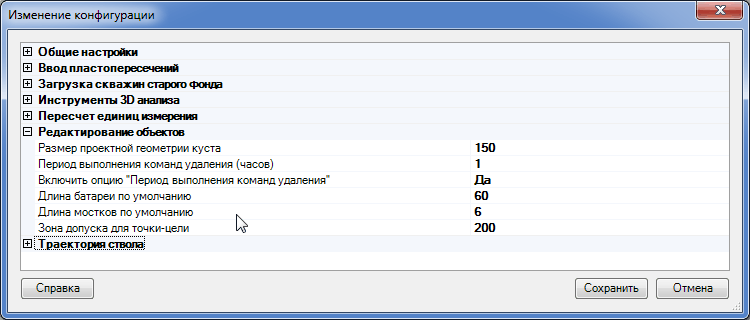 Установлены значения длины батареи и мостков по умолчанию (0,40 х размер стороны квадрата проектной геометрии куста и 0,10 х длину батареи, соответственно). Данные параметры задаются при помощи диалога Изменение конфигурации раздела Администрирование.