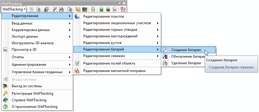 Для того чтобы создать в базе данных новый объект Батарея следует из ниспадающего меню WellTracking выбрать меню Редактирование батареи. В появившемся подменю выберите пункт Создание батареи.