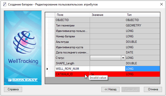 Визард выделяет красным цветом строки с некорректными параметрами. Кнопка Далее в этом случае блокируется.