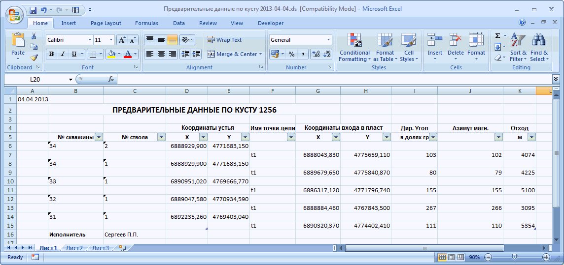 Ниже показан пример отчета Предварительные данные по кусту в формате *.xls.