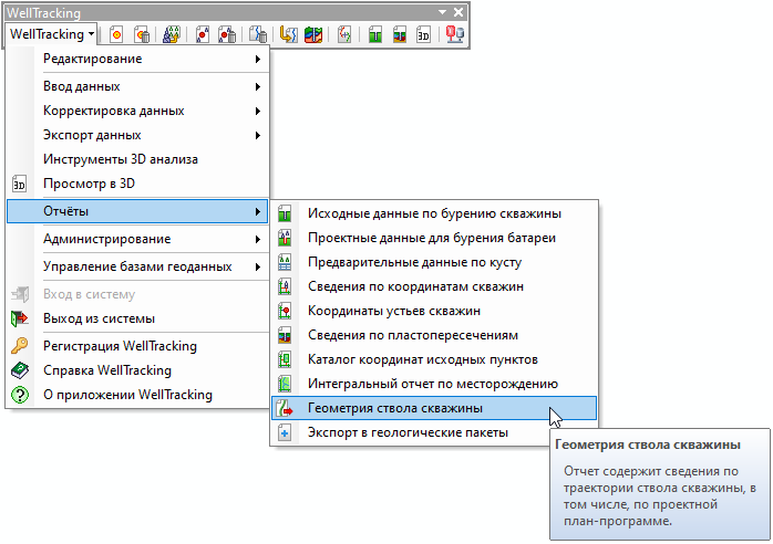 Для того чтобы сформировать данный отчёт следует из подменю Отчёты выбрать пункт Геометрия ствола скважины.
