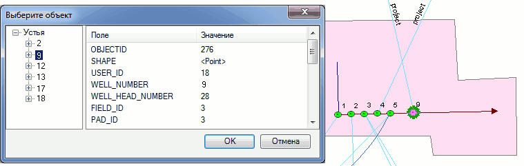 Все скважины, попавшие в нее, будут представлены в таблице Выберите объект. Выделите строку таблицы, соответствующую скважине, и атрибутика выбранного объекта будет показана в правой таблице Поля объекта, а сам он будет подсвечен на карте. Нажмите на кнопку ОК таблицы и диалоговое окно заполнится автоматически.
