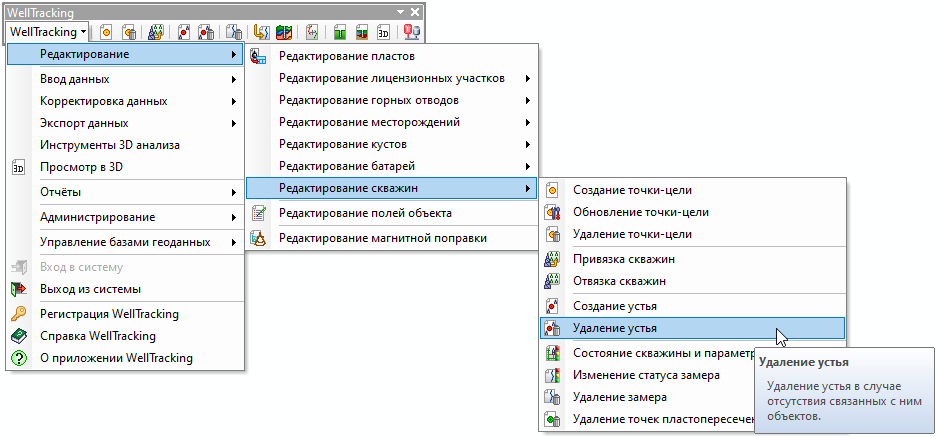 Команда Удаление устья вызывается из подменю Редактирование скважин.