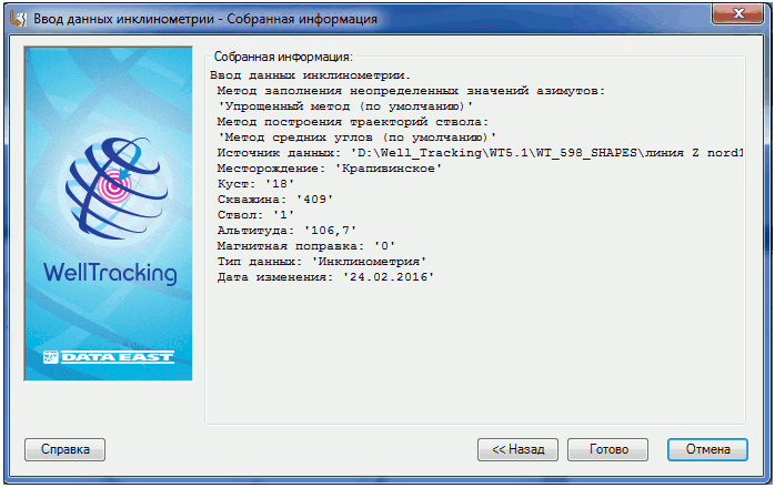 После успешной обработки данных программа выдает сообщение об окончании работы. Нажмите на кнопку ОК и закройте визард Ввод данных инклинометрии.
