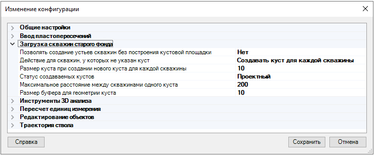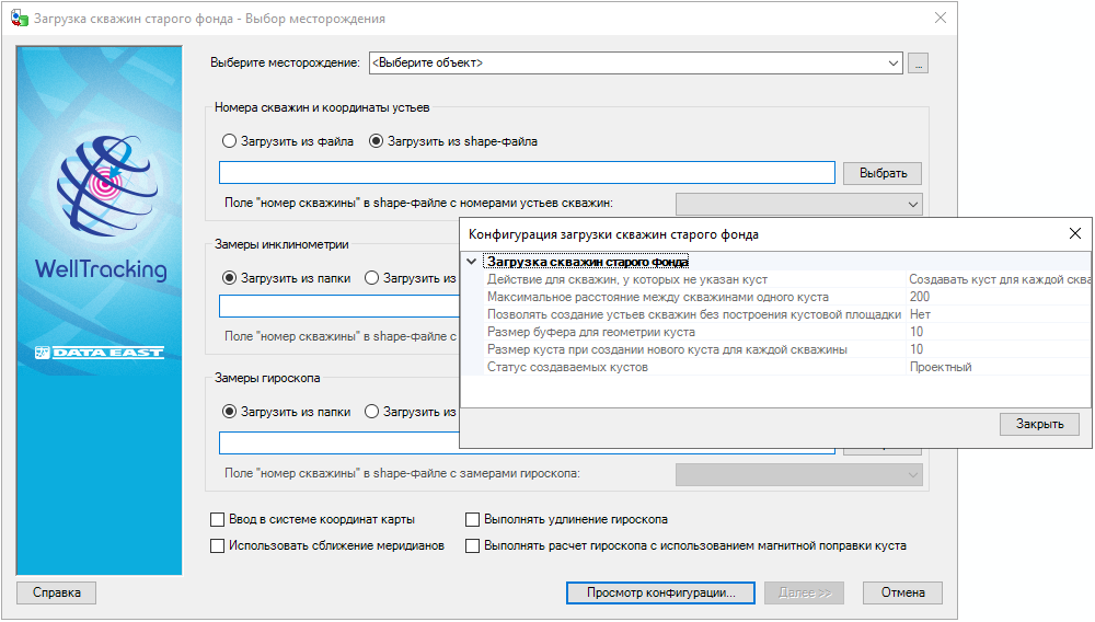 При нажатии на кнопку Просмотр конфигурации откроется окно с настройками, заданными Администратором системы в разделе Администрирование -> Изменение конфигурации -> Загрузка скважин старого фонда.