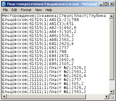 Информация в файле пластопересечений описывается 5 полями: Месторождение, Скважина, Ствол, Пласт, Глубина.