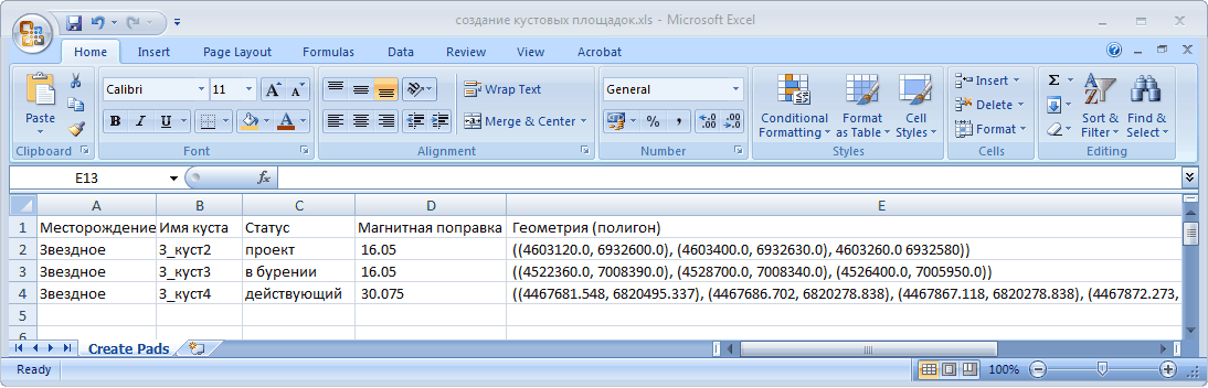 Пример файла в формате *.xls с параметрами кустов для ввода в базу данных при помощи инструмента геообработки "Создание кустов" показан ниже. Обратите внимание на то, что координаты X, Y введены в соответствии с математической моделью: X-долгота на восток Y - широта на Север.