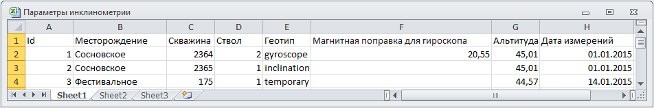 Пример файла в формате *.xlsx с параметрами инклинометрии для ввода в базу данных при помощи инструмента геообработки "Загрузка инклинометрии".