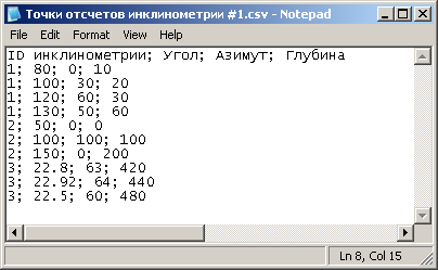 Пример файла с отсчетами инклинометрии в формате *.csv, используемого для работы инструмента "Загрузка инклинометрии".